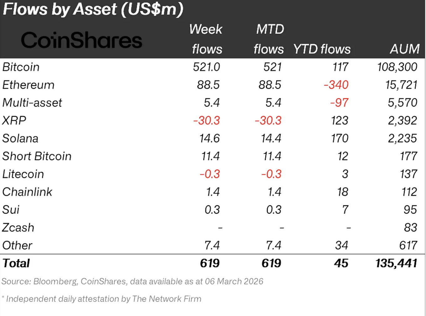 В период со 2 по 6 марта криптовалютные инвестиционные продукты зафиксировали чистый приток средств в $619 млн. Однако, согласно отчету аналитиков CoinShares, динамика недели была крайне неоднородной.