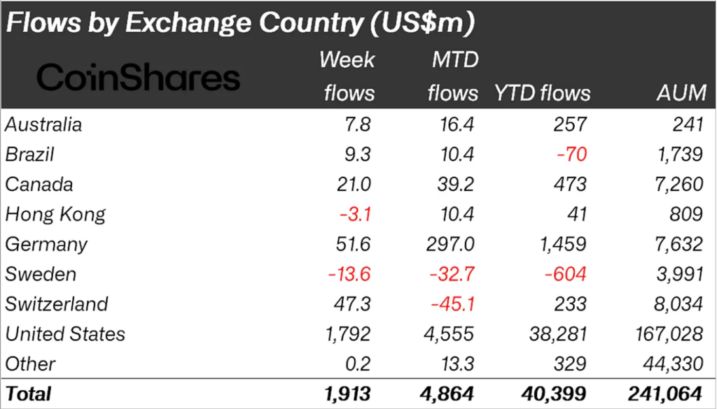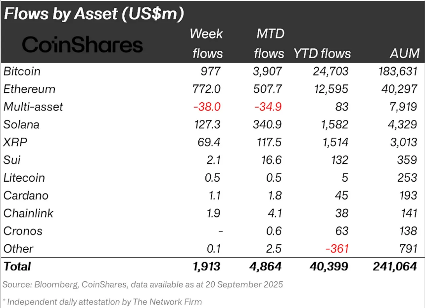 Согласно отчету Coinshares, с 12 сентября по 20 сентября, Cryptophone привлекла 1,9 миллиарда долларов инвестиций, а общий актив в соответствии с их руководством (AUM) достиг 40,4 миллиарда долларов, обновив годовой максимум. Это указывает на восстановление интереса инвесторов к цифровым активам.