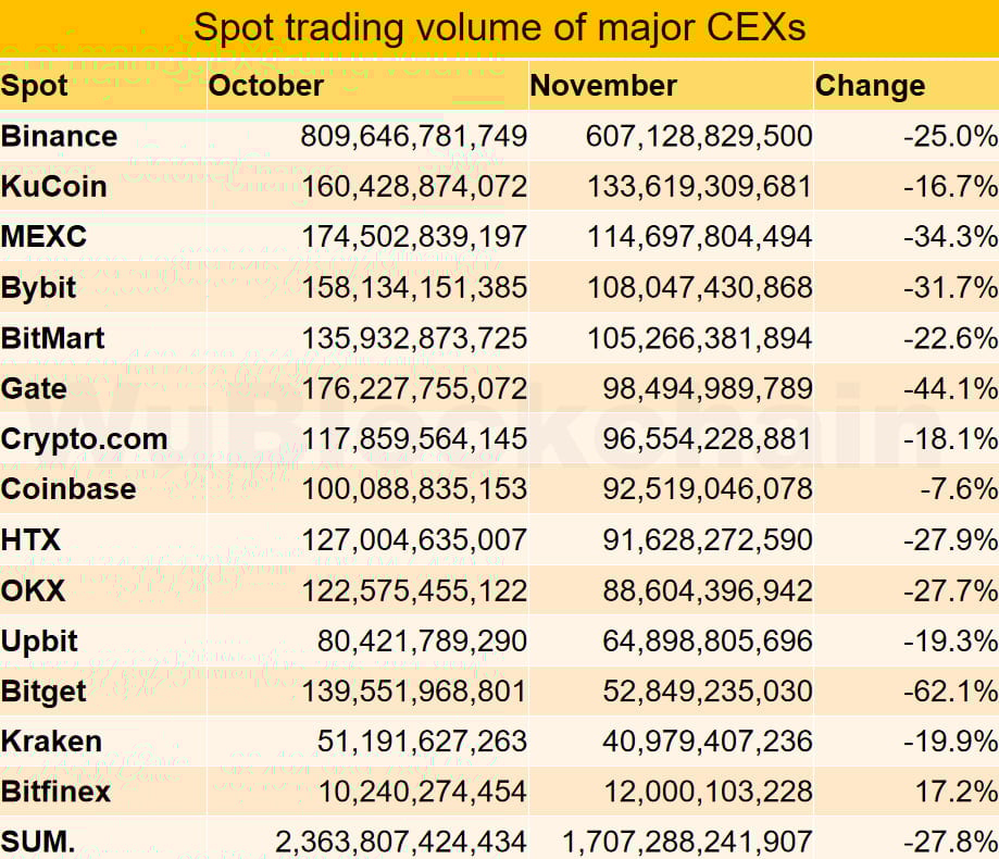 Ноябрь 2025 года ознаменовался заметным спадом торговой активности на мировых криптовалютных биржах. По данным аналитической компании WuBlockchain, совокупный объем спотовой торговли на платформах снизился на 28% по сравнению с октябрем.