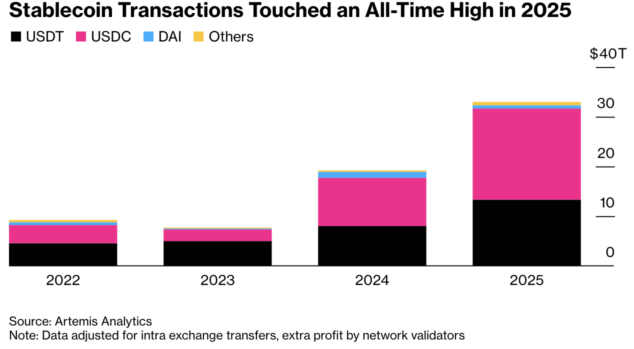 Прошлый год стал поворотным для рынка стейблкоинов. Благодаря благоприятной политике администрации президента США Дональда Трампа и принятию ключевого законодательства общий объем транзакций с «цифровыми долларами» увеличился на 72%, достигнув невероятной отметки в $33 трлн. Об этом сообщает Bloomberg.