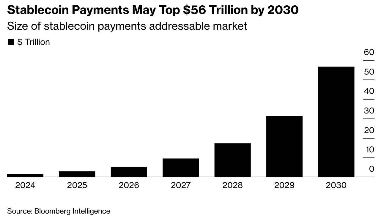 Несмотря на предупреждения МВФ о возможных угрозах традиционной банковской системе, рынок продолжает ускоряться. Только в четвертом квартале 2025 года объем транзакций достиг рекордных $11 трлн. Аналитики Bloomberg Intelligence прогнозируют, что к 2030 году общий объем платежей в стейблкоинах может достичь $56 трлн.