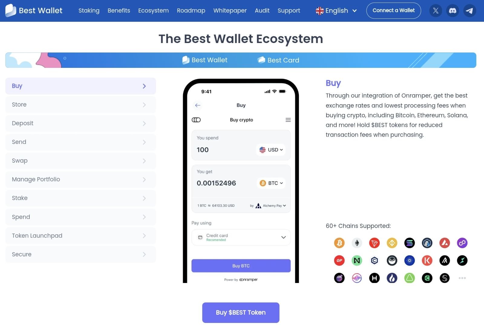 Собственный токен $ Best — это основа лучшей экосистемы кошелька. Он выпускается на блокчейне (независимая сеть с его токенами, правилами и приложениями) Ethereum, работает от ERC-20, то есть полной цифровой монеты, которую можно хранить в кошельке, передаваемой, используемой для оплаты комиссий или получения за деятельность.