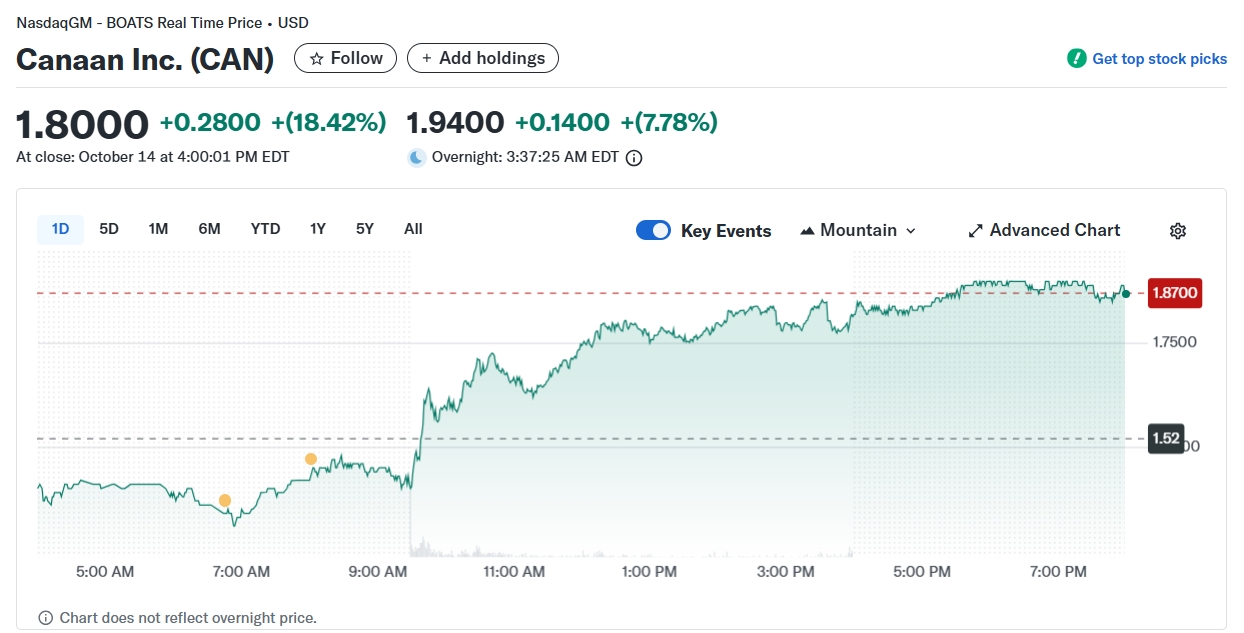 Инвесторы позитивно отреагировали на эту новость: на закрытии торгов 13 октября акции CANAAN выросли до $1,52, показав дневной рост на 40,09%. При этом бумаги компании продолжали расти и на момент закрытия торгов 14 октября уже составляли $1,80.