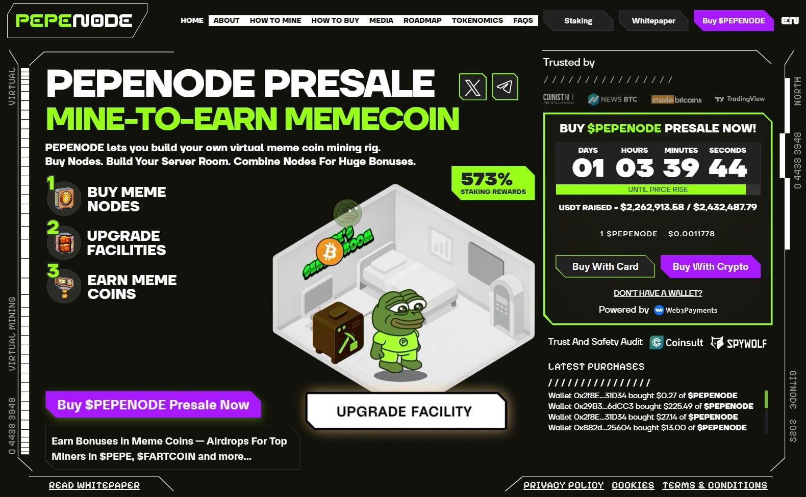 Pepenode представляет собой другой тип memcoin, поскольку он делает ставку на механику майнинга, чтобы заработать. Пользователи собирают виртуальные узлы и выполняют внутриигровые действия, за которые получают награды. Этот формат позволяет объединить мем-культуру, геймплей и экономику Web3.
