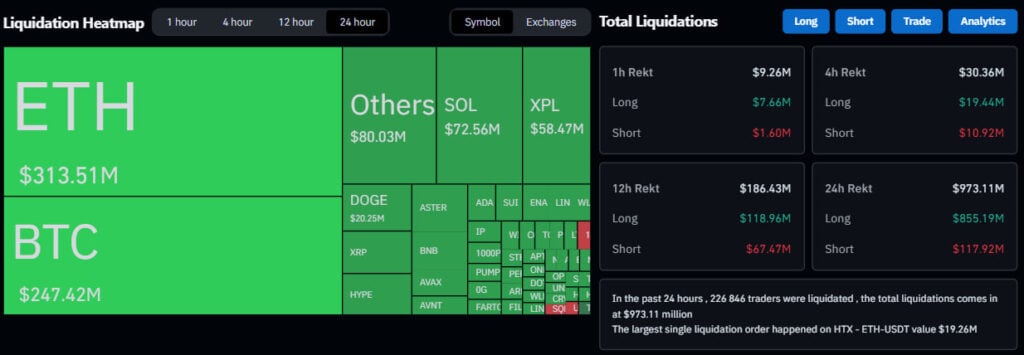 Падение биткойнов и других ведущих криптовалют привело к массовой ликвидации на рынке фьючерсов на криптовалюту. За последний день общий объем ликвидированных позиций превысил 970 миллионов долларов.