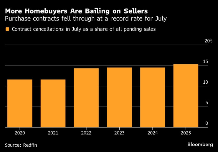 По данным Redfin, в июле было отменено около 58 000 контрактов, что эквивалентно 15,3% домов, для которых были заключены контракты. Это самый высокий процент отмененных контрактов на июль 2017 года, сообщила брокерская компания.