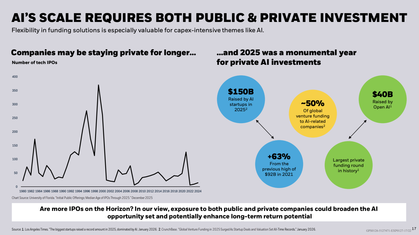 В 2025 году AI-стартапы уже привлекли около $150 млрд (включая рекордный раунд OpenAI в $40 млрд). В 2026 году эта тенденция только усилится за счет слияния государственного и частного рынков капитала.