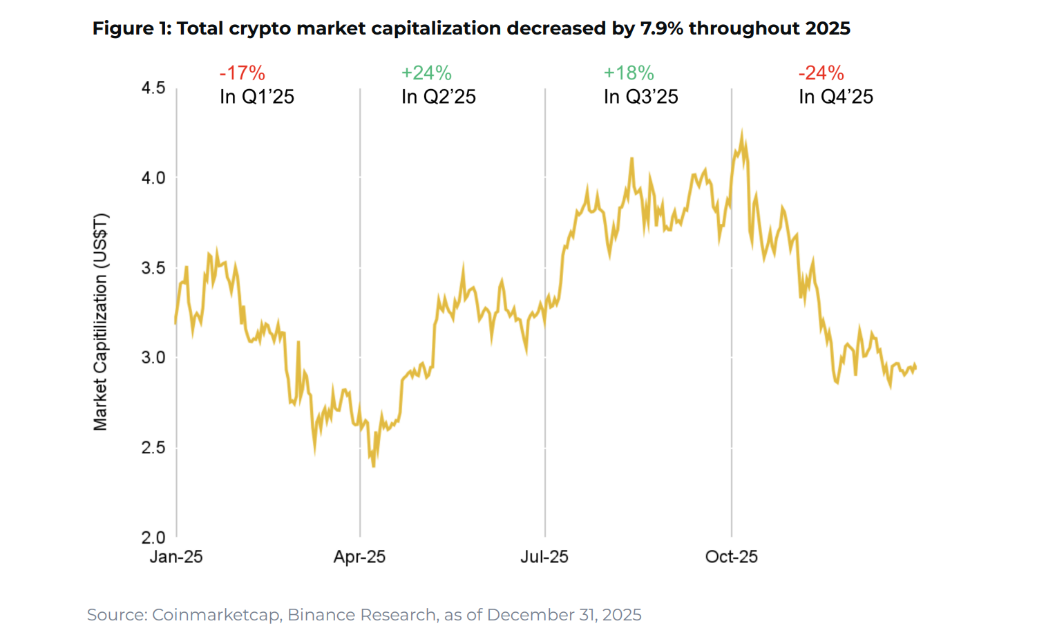При этом по итогам года рынок завершил год снижением примерно на 7,9%, а внутригодовой диапазон колебаний капитализации составил около 76%: от ~$2,39 трлн (апрель) до ~$4,22 трлн (октябрь).