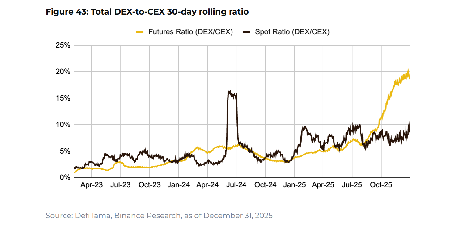 При этом одним из главных сигналов является не цена активов, а вовлеченность: ежемесячные активные пользователи децентрализованных протоколов — 353 миллиона. На этом фоне соотношение DEX к CEX достигло исторического уровня — почти 20% на спот и 10% на фьючерсах в конце 2025 года, что отражает растущую роль ончейн-исполнения.