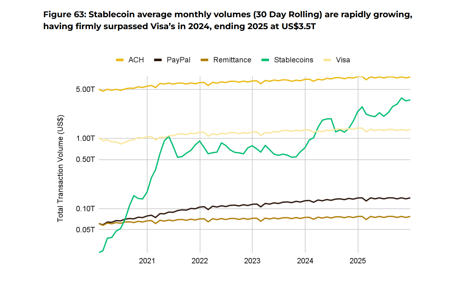 Отдельный акцент в отчете сделан на стейблкоины как доминирующий расчетный слой. В 2025 году они обработали около $33 трлн годового объёма транзакций (+~72% г/г) при капитализации около $300 млрд.