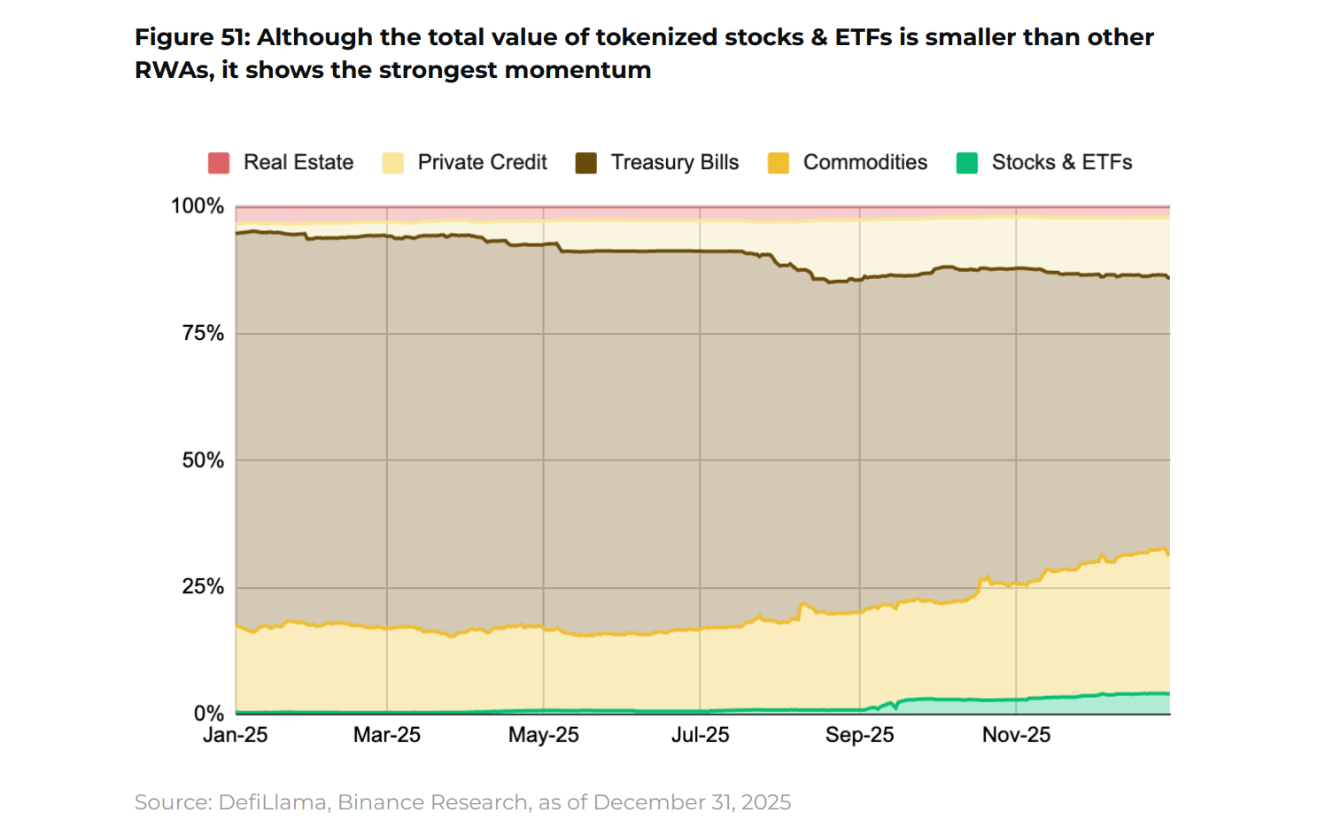 В разделе об инфраструктурных «рельсах» для учреждений Binance Research отмечает ускорение токенизации: акции ончейн выросли с $270 млн до $780 млн, а ончейн-облигации — с $4,2 млрд до $9,8 млрд.
