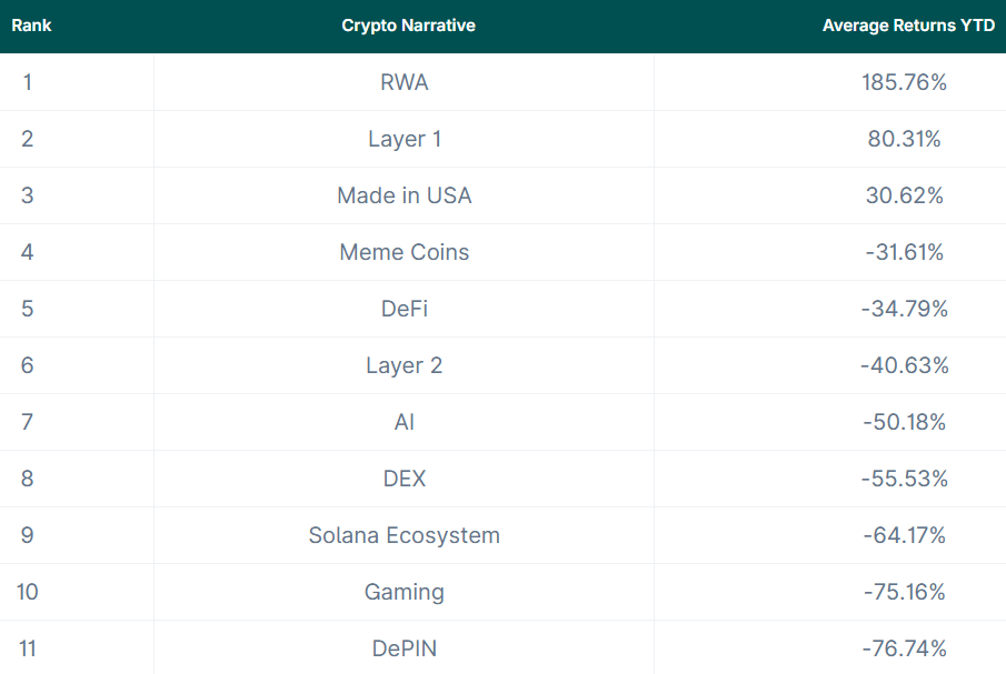 Сектор реальных токенизированных активов (RWA) показал самую высокую среднюю доходность в криптоиндустрии за 2025 год. Показатель составил 185,8%, что сделало это направление главным фаворитом инвесторов на фоне общей коррекции рынка. Об этом говорится в новом отчете CoinGecko.