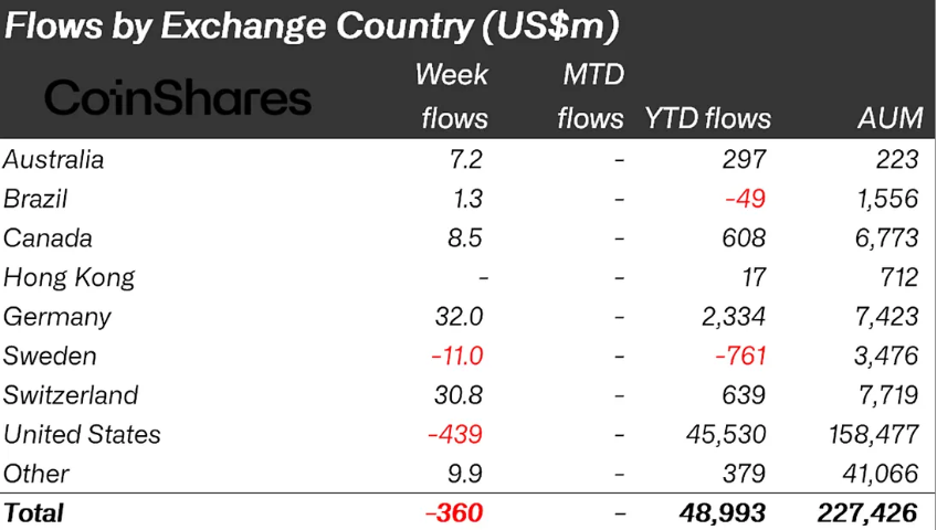 Негативные настроения инвесторов наиболее ярко проявились в США, где отток из криптофондов достиг $439 млн. Эти потери были частично компенсированы притоком средств в продукцию, зарегистрированную в Германии (32 млн долларов) и Швейцарии (30,8 млн долларов).