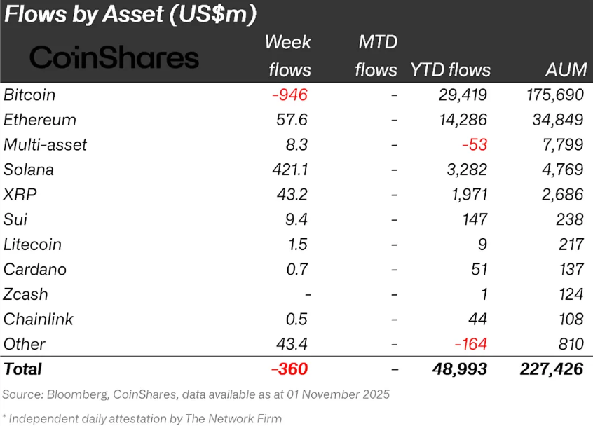 Прошедшая неделя, с 27 по 31 октября, ознаменовалась существенным оттоком средств из инвестиционных продуктов на основе криптовалют. Общие потери криптофондов составили $360 млн, говорится в отчете аналитической компании CoinShares.
