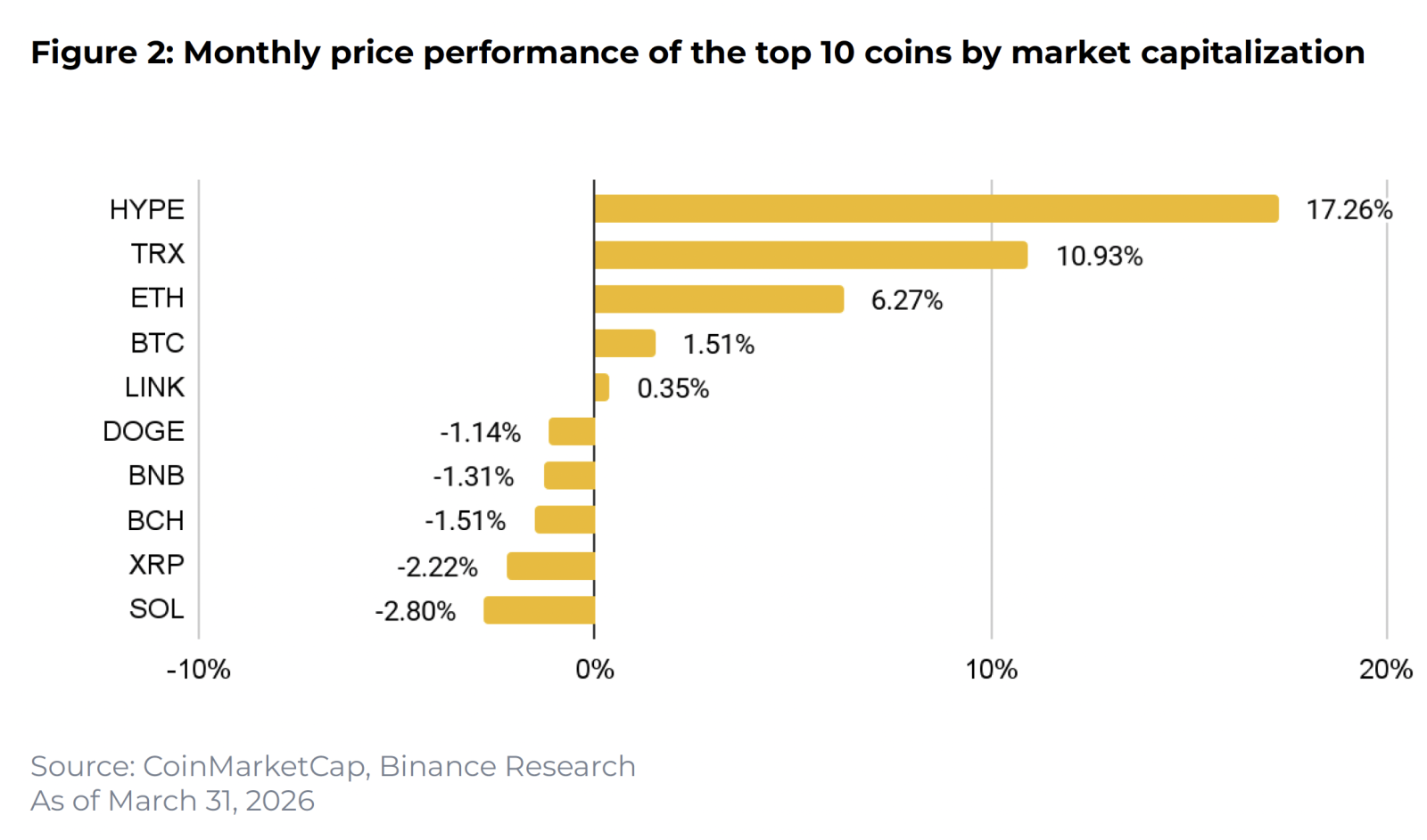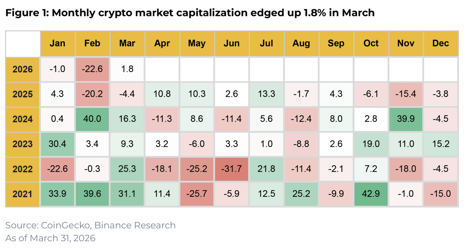 Март прошел под влиянием конфликта между США и Ираном. Из-за сбоев в мировой торговле нефтью Brent подорожала на 36%, индекс волатильности VIX в пике достиг 35, индекс S&P 500 снизился на 5,3%, золото — на 14,1%, а доходность 10-летних государственных облигаций США выросла на 46 базисных пунктов. На этом фоне Bitcoin и Ethereum прибавили 1,51% и 6,27% соответственно.