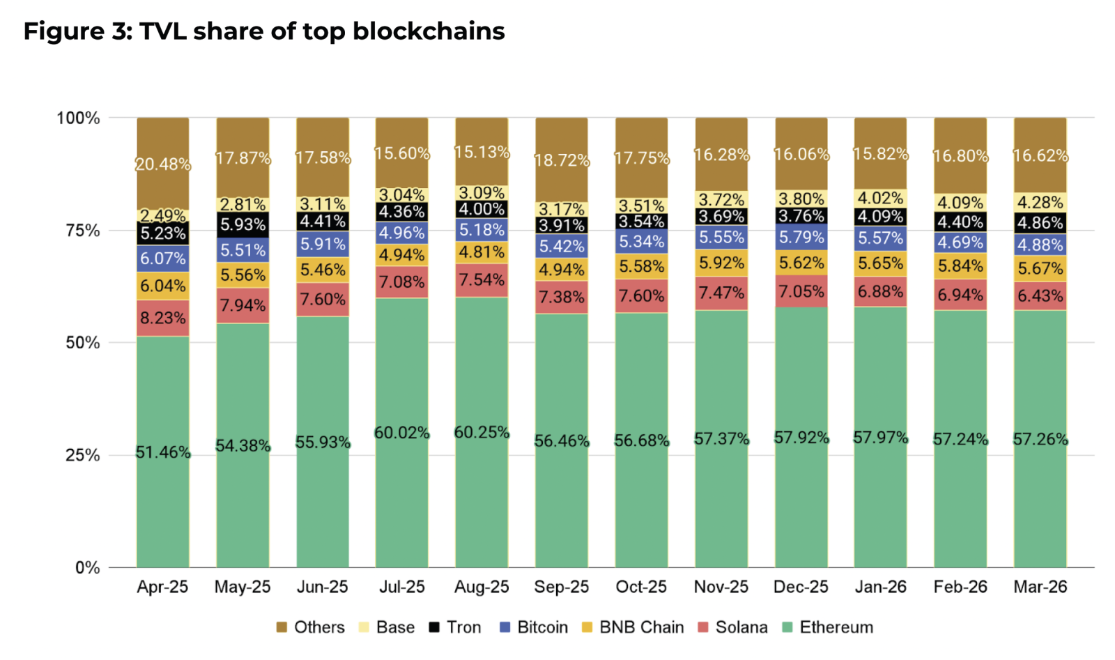 В марте совокупная заблокированная стоимость активов в децентрализованных финансах (Total Value Locked, TVL) снизилась до $92,83 млрд или на 3,3% по сравнению с предыдущим месяцем. Среди пяти самых крупных экосистем Ethereum, BNB Chain и Base немного нарастили свою долю, но общая структура рынка почти не изменилась.