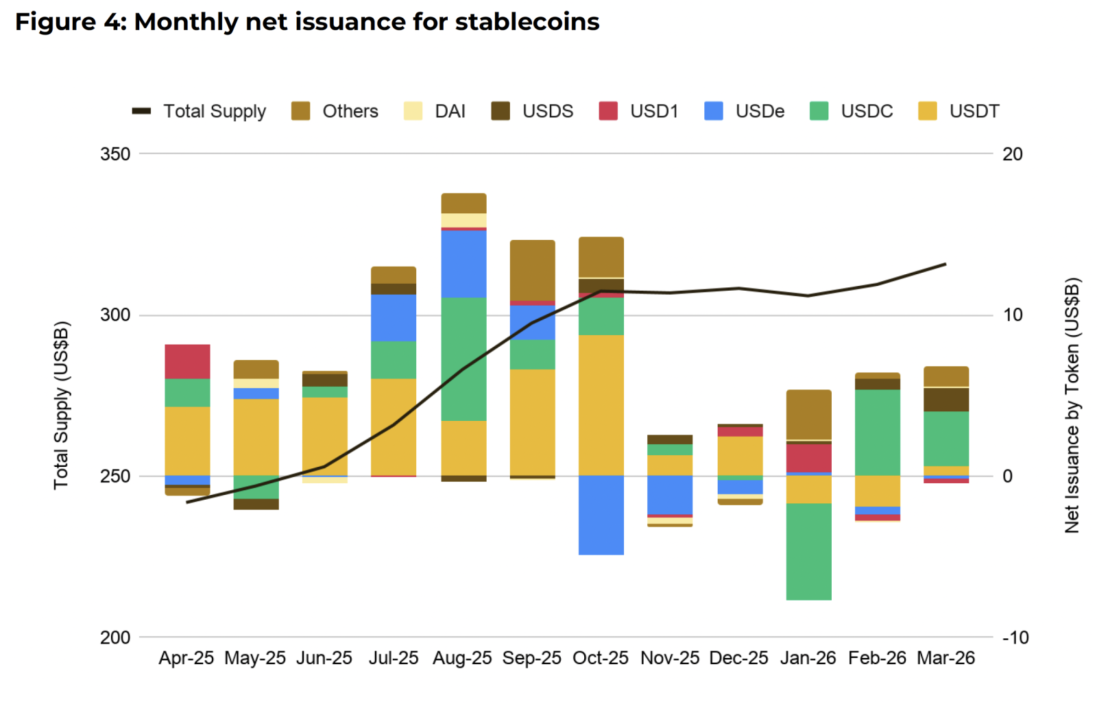 Совокупное предложение стейблкоинов в марте удерживалось около отметки $315 млрд и выросло на 0,11% по сравнению с предыдущим месяцем. Давление на сегмент создало новый драфт US Clarity Act, предусматривающий ограничение на доходность и вознаграждения за пассивное содержание стейблкоинов. На этом фоне акции CRCL за день теряли около 20%. Дополнительным фактором стало заявление Tether об аудите одной из компаний Big 4.