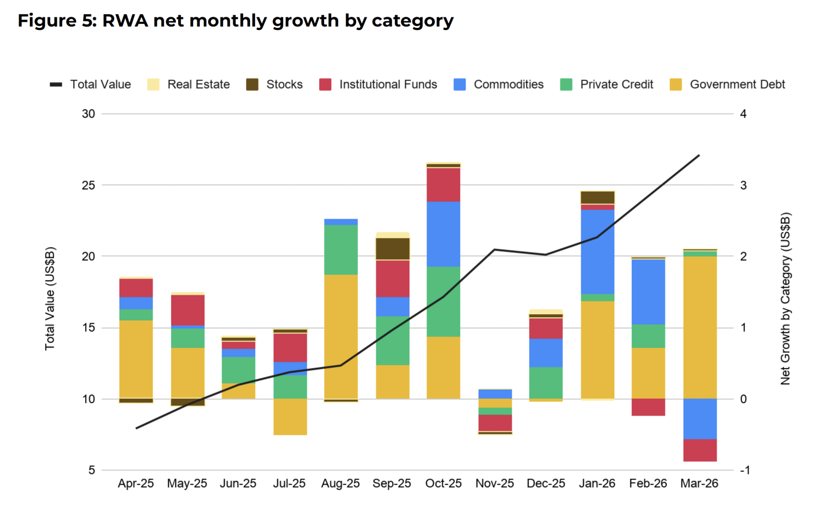 Отдельно выделялась BNB Chain: общая стоимость RWA в этой сети выросла до около $3,4 млрд или на 35,8% в месяц. Более 92% этого объема приходится на долговые инструменты Казначейства США. Среди крупных продуктов USYC от Circle вырос примерно на 42% до более чем $2,6 млрд, а BUIDL от BlackRock — примерно на 12% до $2,2 млрд. В конце месяца BlackRock интегрировала в BUIDL систему Chronicle’s Proof of Asset для повышения прозрачности.