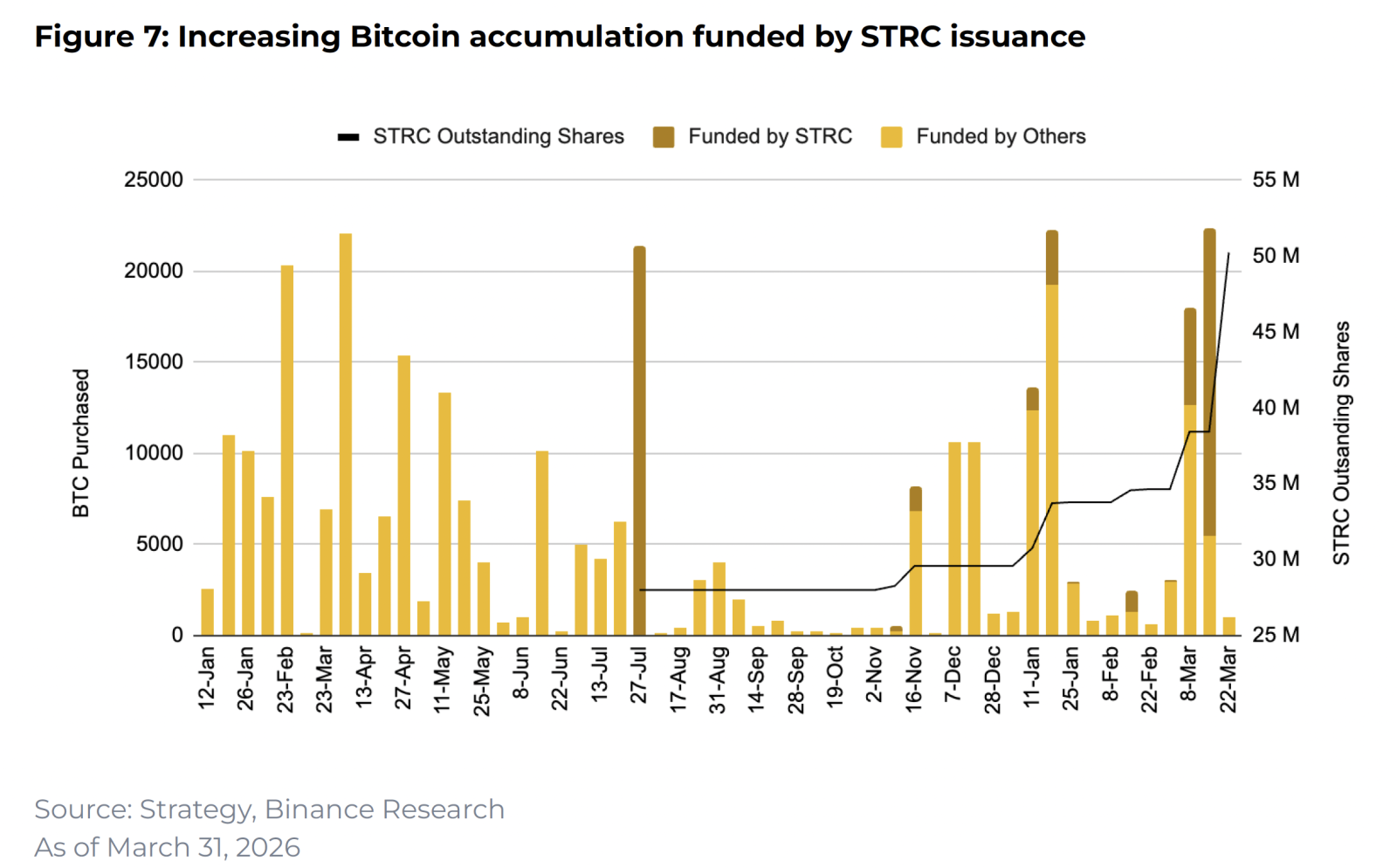 С начала 2026 года она купила почти 90 тыс. BTC на сумму около $7,25 млрд — это 40% от годового объема покупок в 2025 году и в 10 раз больше, чем во время медвежьего рынка 2022 года. Спрос на STRC дополнительно поддерживают доходность более 11% и более высокий приоритет этих акций по сравнению с MSTR. В марте объем торгов STRC достиг рекордных $4,35 млрд, что на 95% больше, чем месяцем ранее.