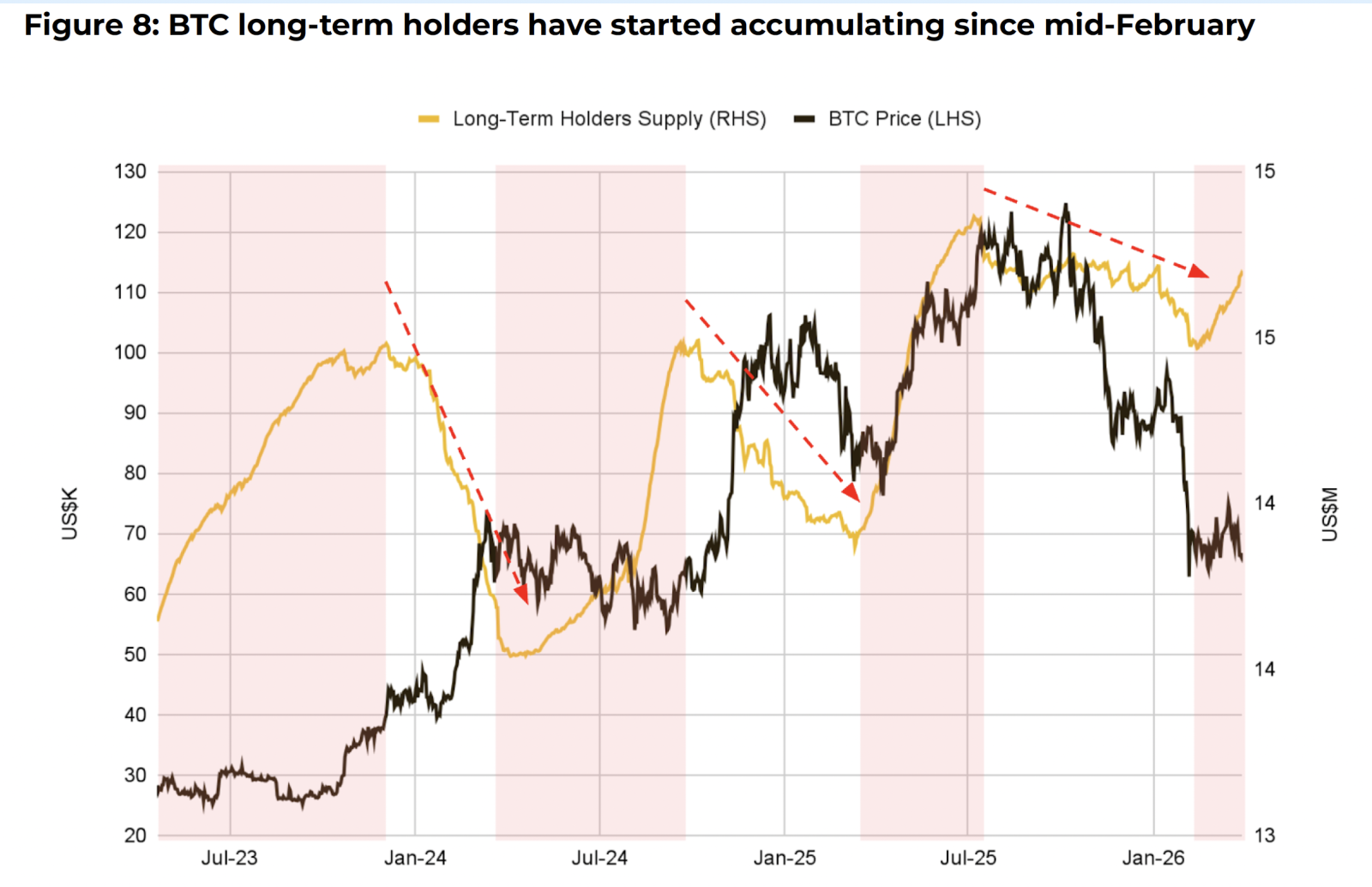 Третий сигнал — возврат накопления со стороны долгосрочных владельцев Bitcoin (long-term holders, LTH). К этой категории относятся участники, чья средняя дата покупки превышает 155 дней. После падения примерно на 46% от исторического максимума октября 2025 года предложение в LTH-кошельках снова начало расти с середины февраля. Март также стал первым положительным месяцем 2026 года для потоков в споте ETF на Bitcoin, которые привлекли около $1,2 млрд. Итого эти сигналы похожи на начало нового цикла накопления.