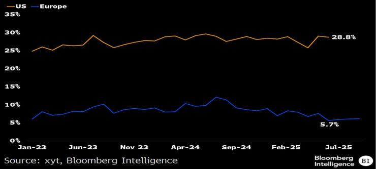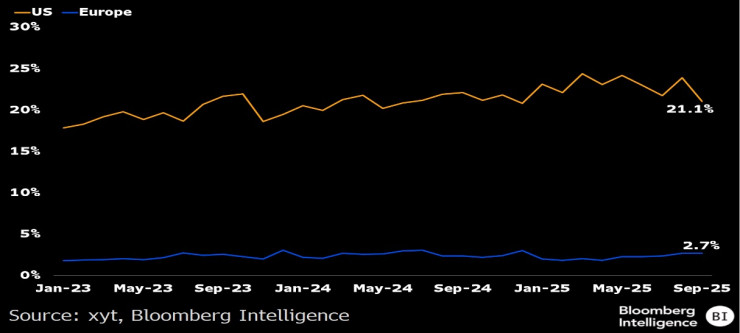 Настроения на рынке опционов в США и Европе продолжают сильно различаться. В сентябре соотношение пут-колл в США упало до 0,66, сигнализируя о сильном бычьем уклоне, поскольку трейдеры предпочитали опционы колл защитным опционам пут.