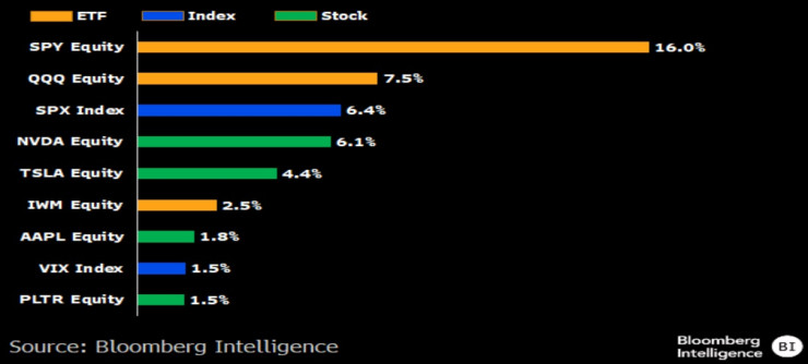 Ликвидность порождает ликвидность, поскольку спреды сужаются, а торговые издержки падают, создавая преимущество для нескольких продуктов в качестве предпочтительных торговых инструментов. QQQ ETF, который отслеживает индекс Nasdaq 100, привлек 7,5% всего объема опционов в 2025 году, а на индекс SPX Cboe приходится 6,4%. Пять крупнейших базовых активов привлекли 40,4% объема торгов опционами, а 30 крупнейших — 62,7%.