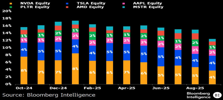 Спекулятивное позиционирование по-прежнему сосредоточено на нескольких акциях, связанных с технологиями и искусственным интеллектом, с высокими бета-коэффициентами, при этом на контракты, связанные с Nvidia, Tesla, Apple, Palantir, AMD и MicroStrategy, приходилось около 12% объема опционов в США в сентябре.