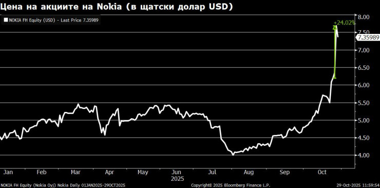 Продолжая вчерашние новости рынка, Nvidia планирует инвестировать 1 миллиард долларов в Nokia Oyj, поскольку ведущий игрок в секторе искусственного интеллекта делает ставку на переход финской компании от мобильных сетевых устройств к искусственному интеллекту. Акции Nokia подскочили больше всего за более чем десятилетие.