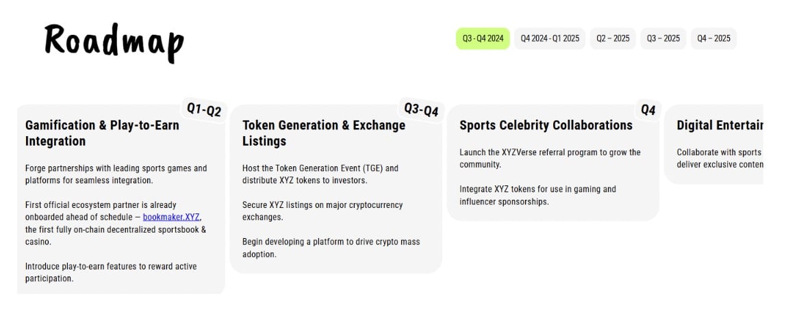 В планах на будущее — запуск приложений «играй, чтобы заработать», дополнительные партнерства в сфере спорта и игр, а также более глубокая интеграция $XYZ в платформу для ставок и болельщиков.