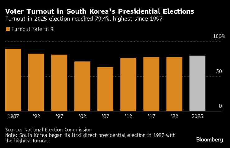 Гостационная деятельность президентских выборов в Южной Корее | Явка выборов 2025 года достигла 79,4%, что является самым высоким с 1997 года.