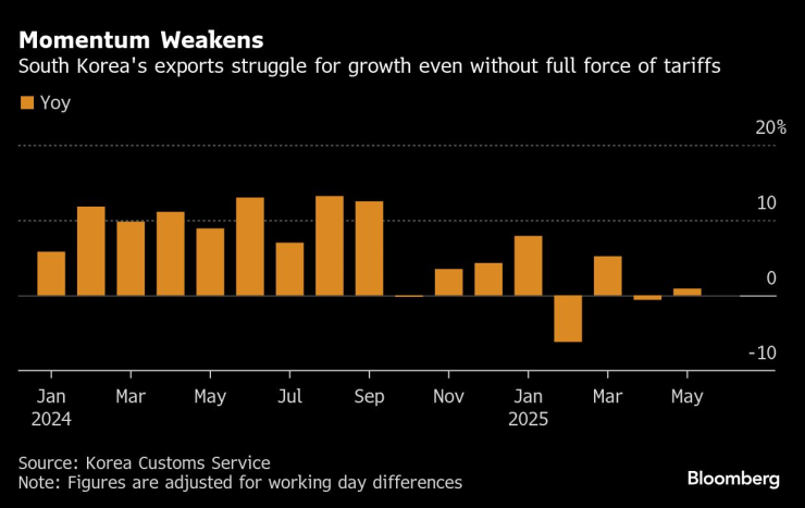 Инерция ослабляет экспорт Южной Кореи, борясь за рост даже без полной силы тарифов